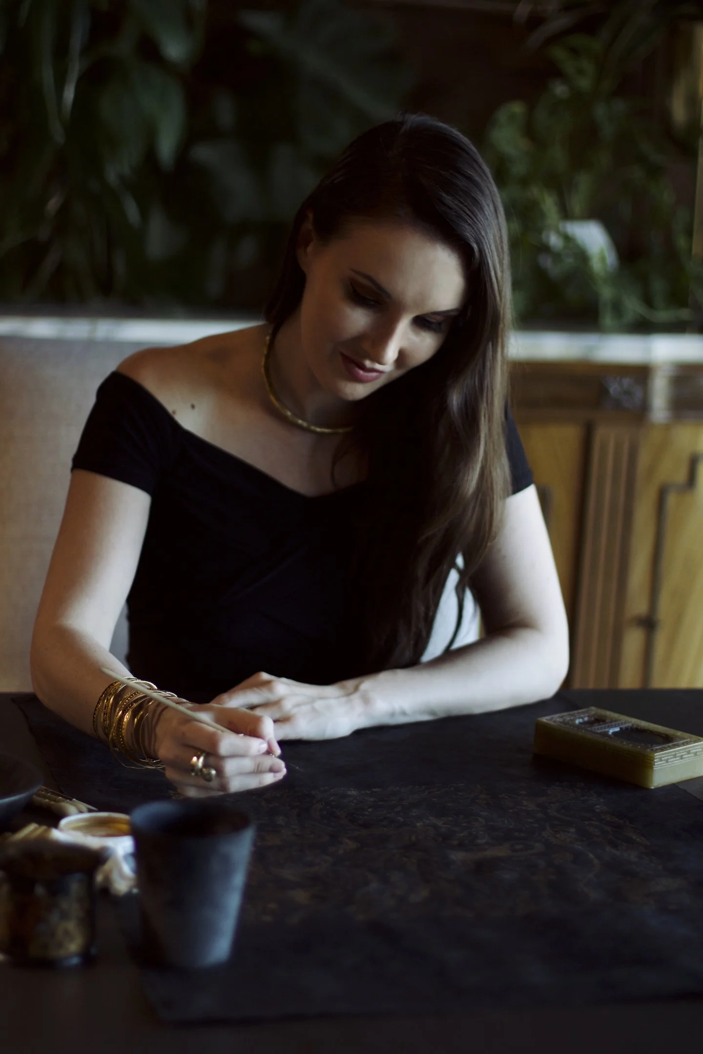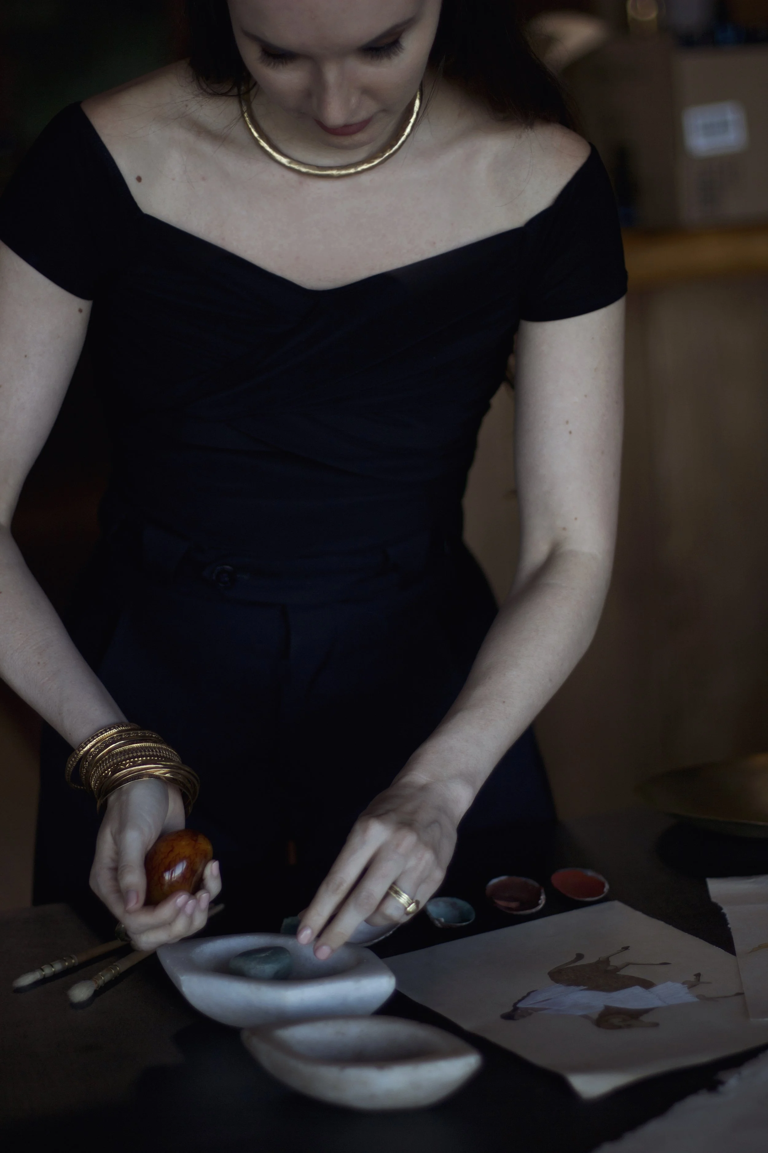 I use traditional methods to polish the paper, transfer my artwork with a porcupine quill, and then paint the details with watercolors, gaouche, or 22 karat gold.