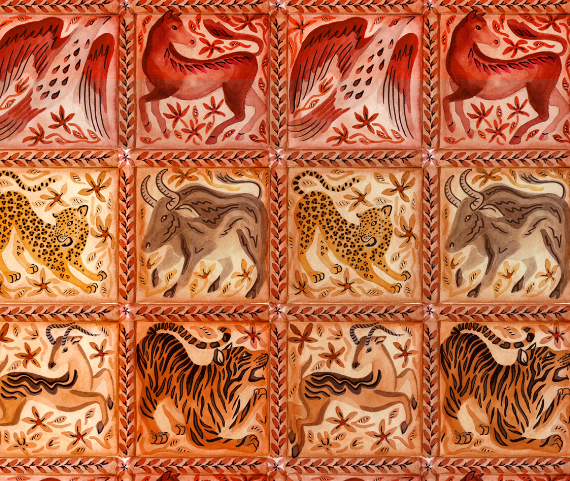 “Creature Glossary” transforms your walls into a living bestiary, where tigers prowl, leopards spring, and ibex leap in rhythmic procession. Inspired by Persian textiles and their storied animal parades, each tile-like panel is framed like a page from an atlas of creatures, bordered with botanical vines. This design conjures beings both wild and mythic, infusing your space with a sense of playful wonder.